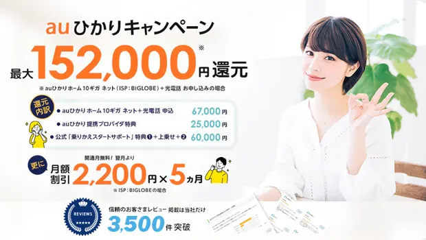 キャンペーンを比較するとauひかりの10ギガはキャッシュバック最大152,000円と超高額です。
