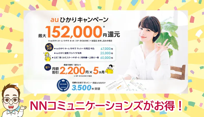 auひかりをNNコミュニケーションズから申し込みをすると特典が豪華で、キャッシュバックも受け取りやすくおすすめです。