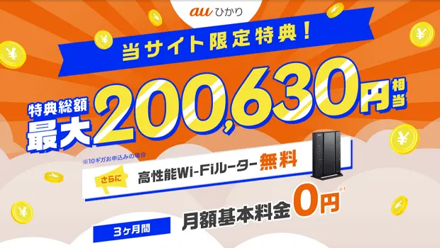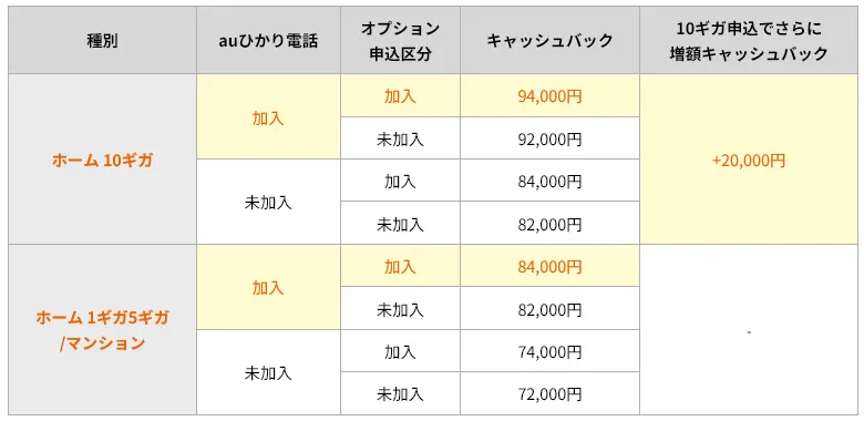 | auひかり ホーム | BIGLOBE So-net @nifty @TCOM au one net | 10,000円 + 上乗せ 20,000円 | 最大20,000円 (1,000円/月× 最大20ヵ月間) | 最大50,000円 |