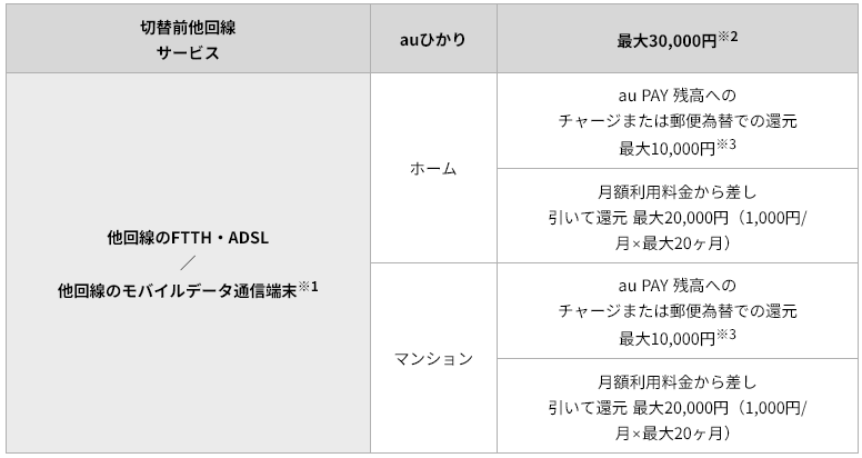 他社からの乗り換えでauひかりの申し込みとauスマートバリューまたはUQモバイル自宅セット割に登録の場合、最大10,000円(毎月1,000円×最大10カ月)をau PAY残高へチャージされます。