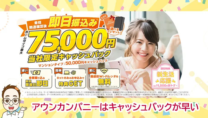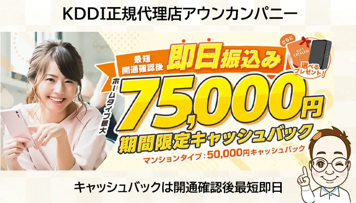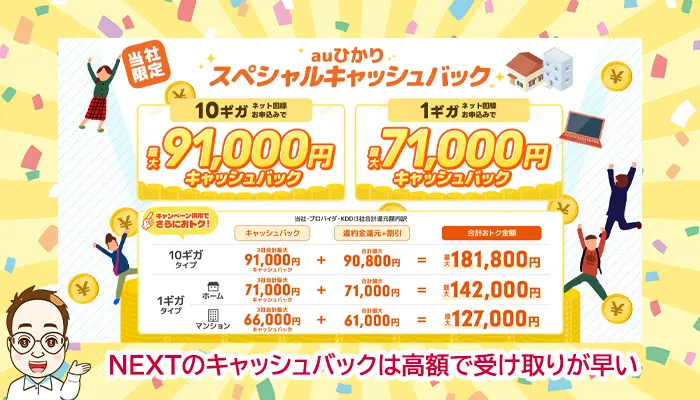特にauひかりの代理店【NNコミュニケーションズ】からの申し込みなら、キャッシュバックも高額で申請方法も電話で行うのでもらい忘れがありません。